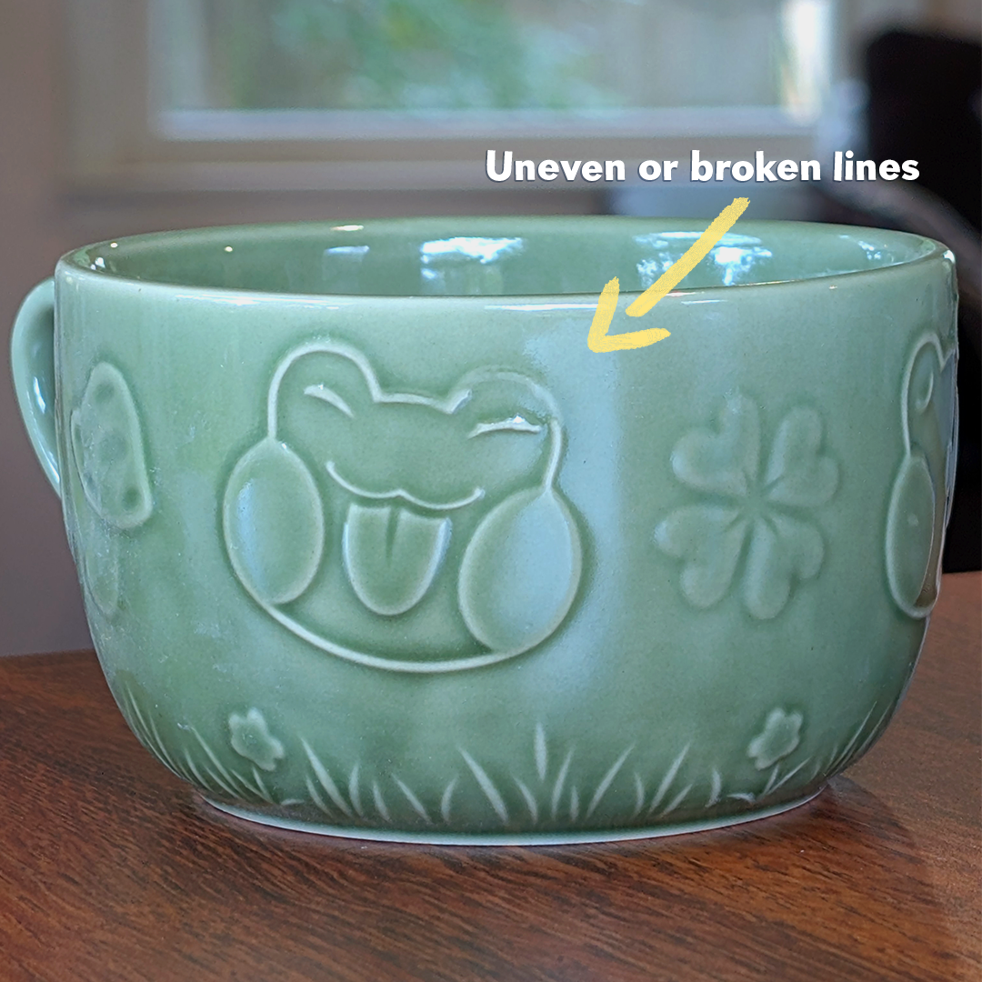 These are the same Rani the Froggie ceramic mugs you know and love, but just a little bit derpy! They have small cosmetic defects that do not affect the integrity or use of the mug at all. Each one is unique! Please look through the images for examples of what the defects may look like.